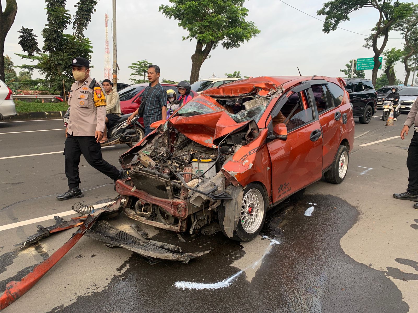 Dalam dokumentasi yang diterima, minibus berwarna orange itu mengalami kerusakan cukup parah pada bagian depan.